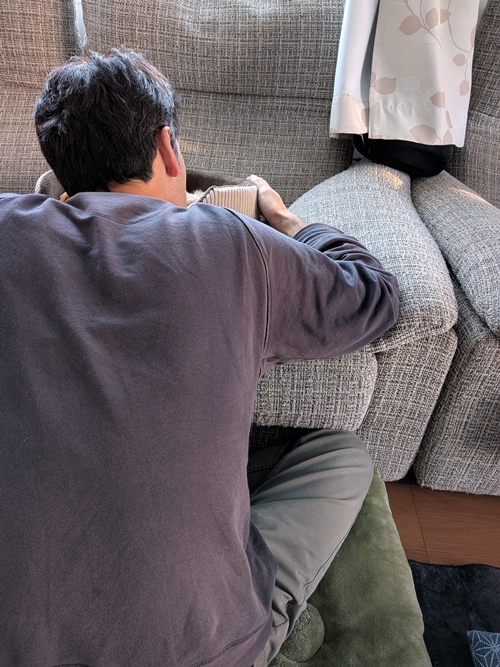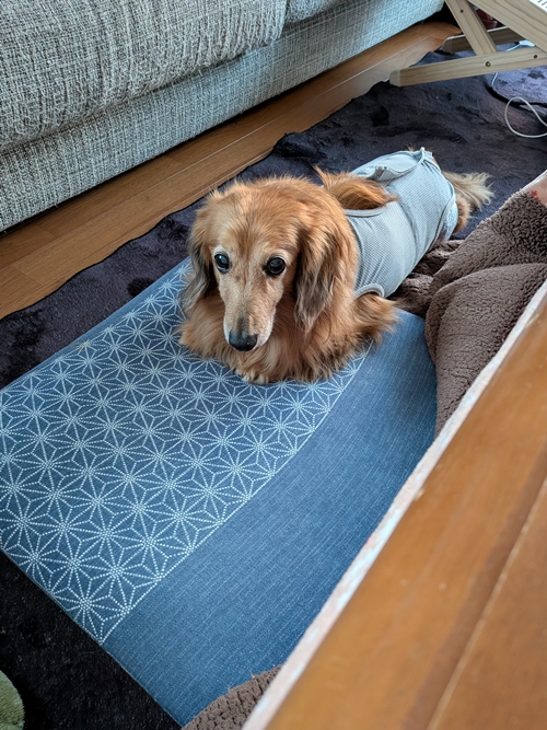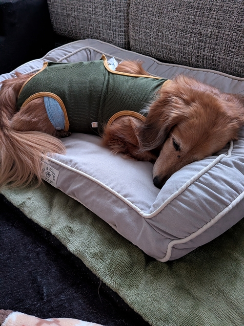 ちゃんこの葬儀を終えた後は、寂しそうにちゃんこが最期まで寝ていたベッドで寝るようになった犬太郎・・・。