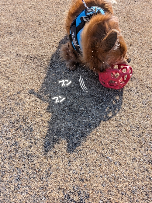 ブンブンとお気に入りの大きいボールを振り回して遊ぶもんだから、芝生が散る散る💦
