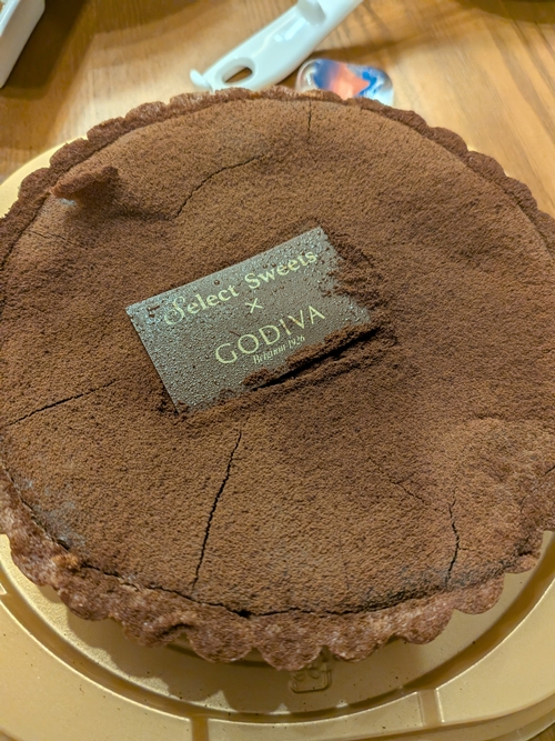 ゴディバのチョコタルトは中央の札もチョコレートで出来ているの全部食べられる仕様。