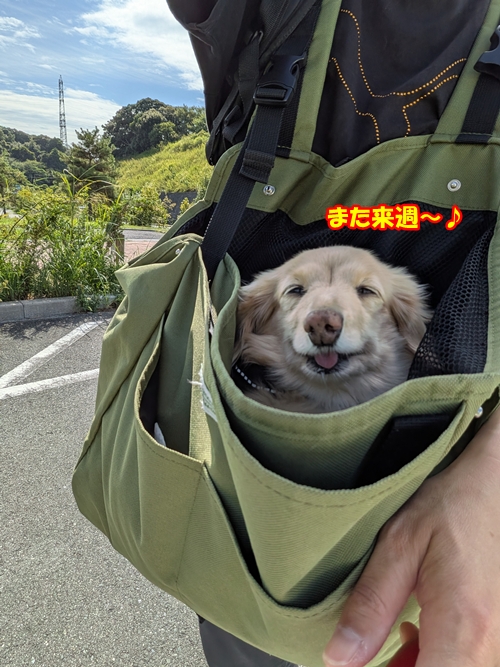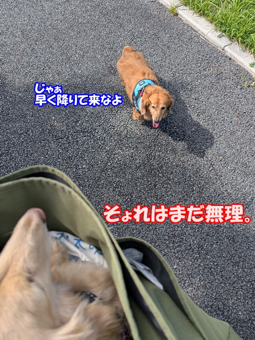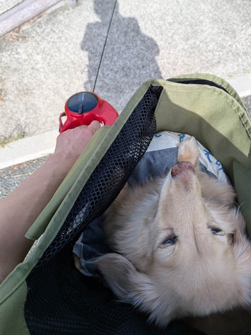 それに対して最大の目的の主人公であるこちらのお嬢は・・・抱っこカバンから高みの見物状態💧