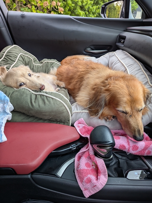 パパさんを会社まで送り届けた後は、静かに寝ちゃう犬太郎君とちゃんこちゃんzzz