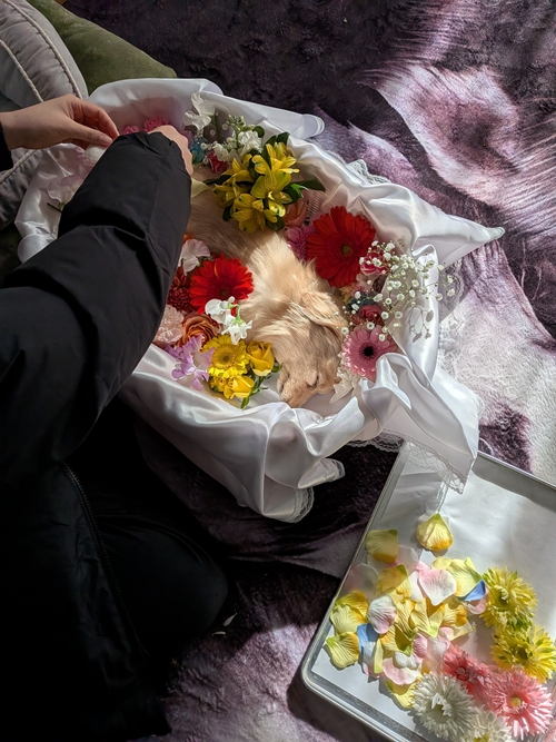 葬儀にはご近所さんから頂いたお花で最期にちゃんこを色鮮やかに飾り付けしました。