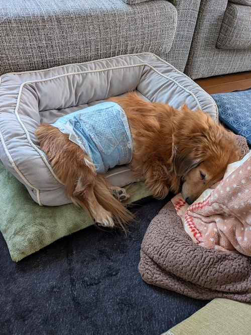 ウンチが出終わり、再度ベッドに戻したところでゆっくりし始めたので様子を見守っていると、モゾモゾと動きながらベッドの外側に出てフローリング部分に寝そべり始めました。