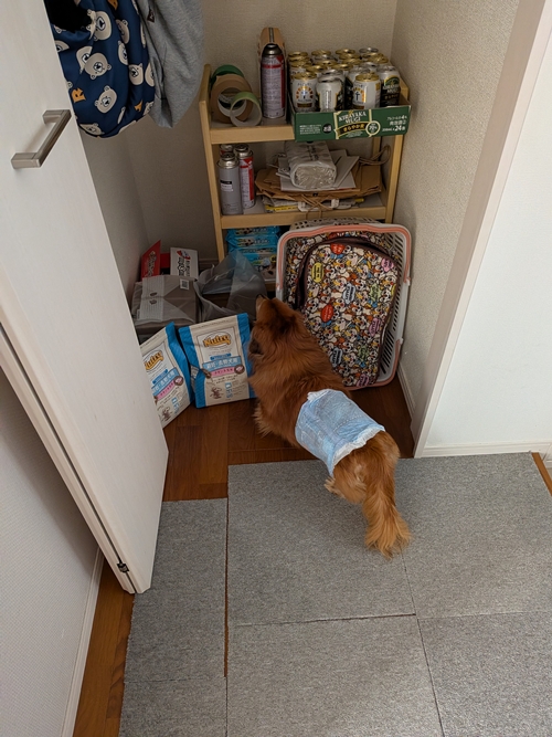 ちゃんこが以前使っていた冬用コートやスリングを仕舞っているクローゼットを毎日開けて、まるでちゃんこの匂いを頼りに妹を探すような行動が見られるようになりました。