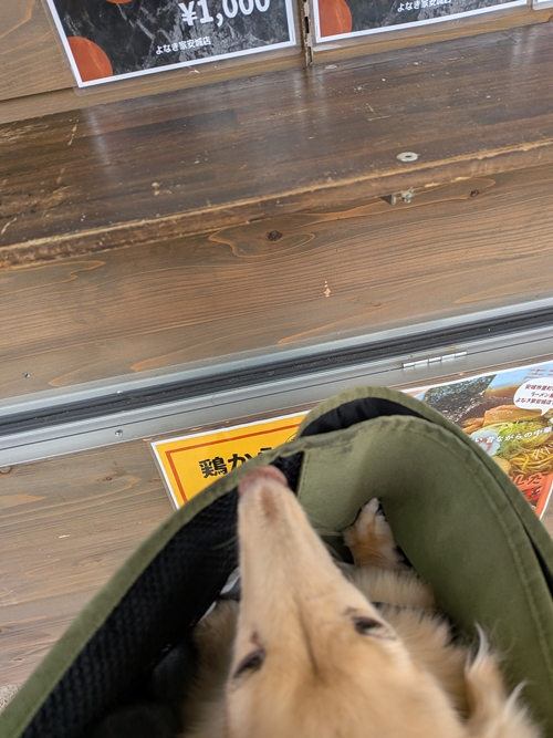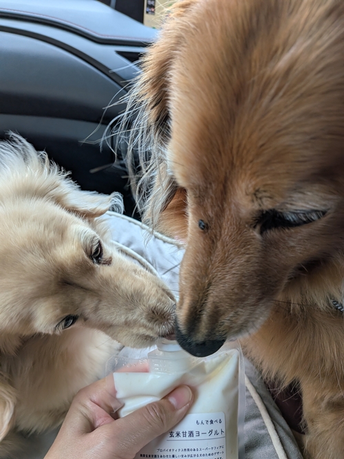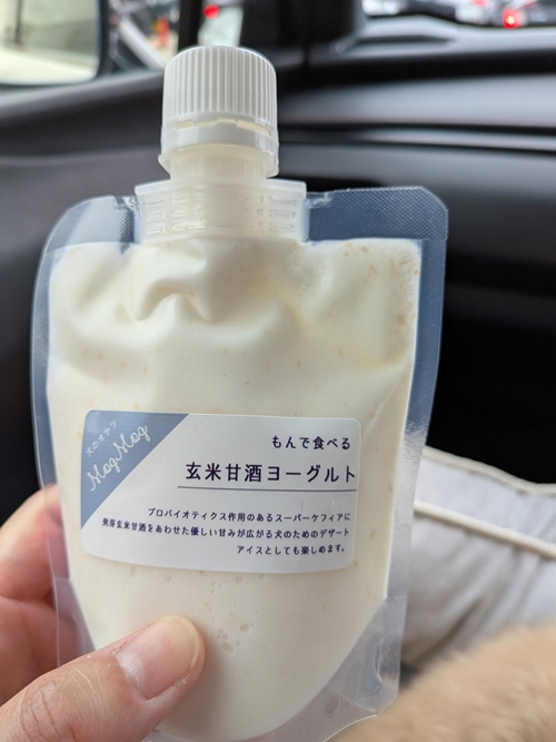 帰りの車内では、お土産用で買った【旨菓楼】の姿ささみと、犬太郎お気に入りのアイス『甘酒ヨーグルトアイス』の両方を食べながら帰りました(笑)