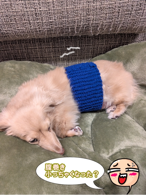 この日は本当に急に寒くなってきて、ちゃんこのお腹も少し緩くなってしまっていたので、ついでに去年に娘のMIUティーンが手編みしてくれた『ちゃんこ用特製腹巻き』も出してきたのですが・・・