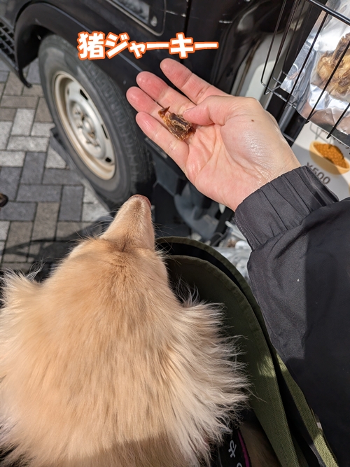 キッチンカーで売られていた猪ジャーキーの試食をもらって車で食べさせてみたところ、二人ともがっついて食べていたので急いでキッチンカーに戻ってすぐに購入!