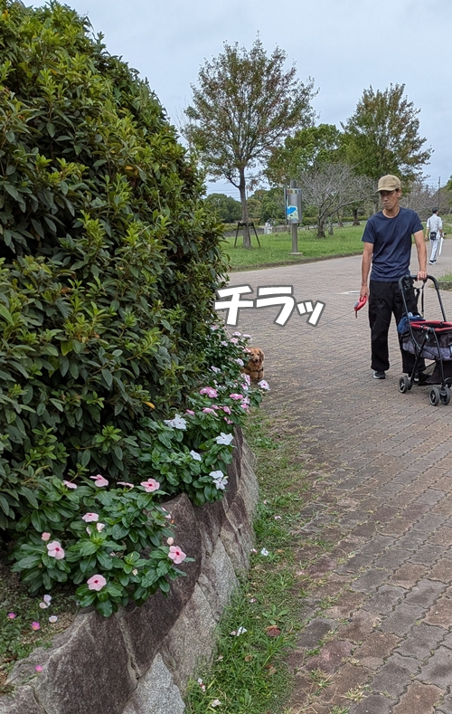 日日草の隙間から『ひょっこりはん』の犬太郎😂